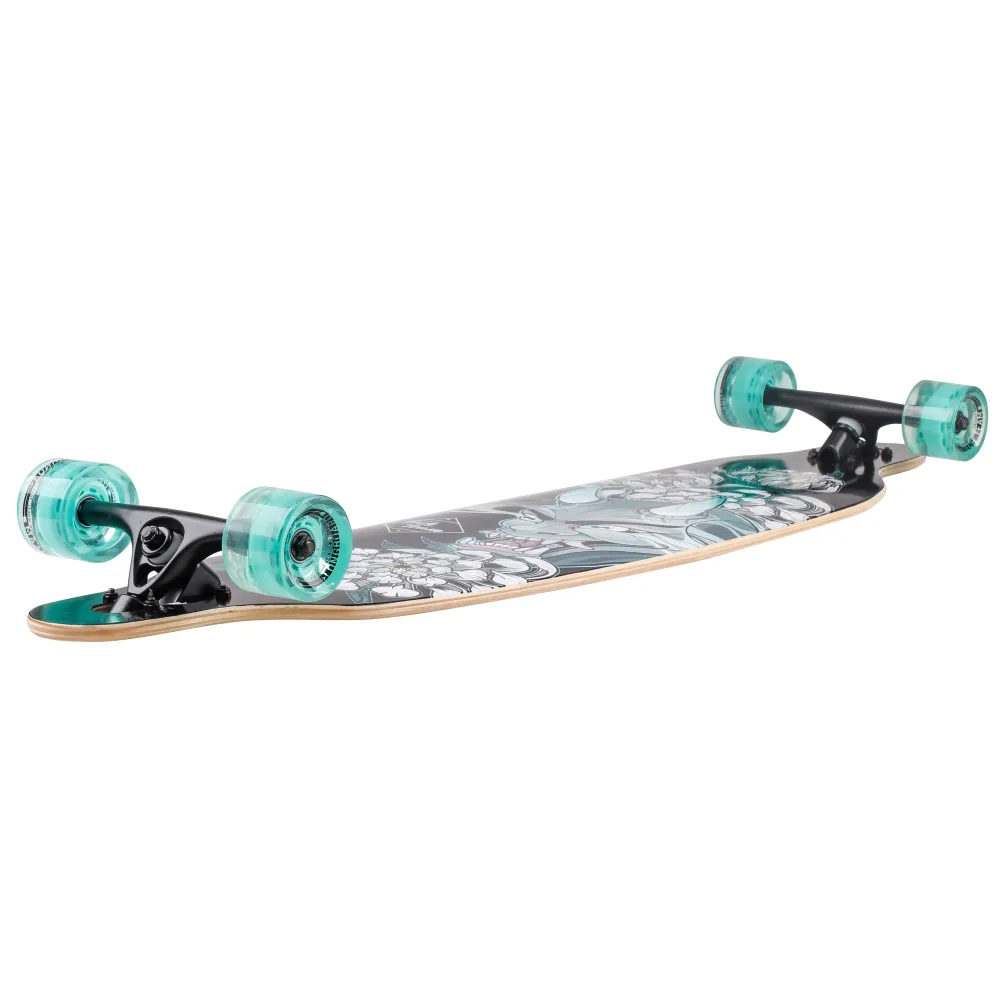 Дека имеет размеры 41 дюйм. Покрыта нескользящей брендовой шкуркой с принтом. Особенности деки минимизируют риски форс-мажорных ситуаций, полностью исключают соскальзывание ног райдера. 7-дюймовая подвеска из высокопрочного алюминия качественная и надежная.