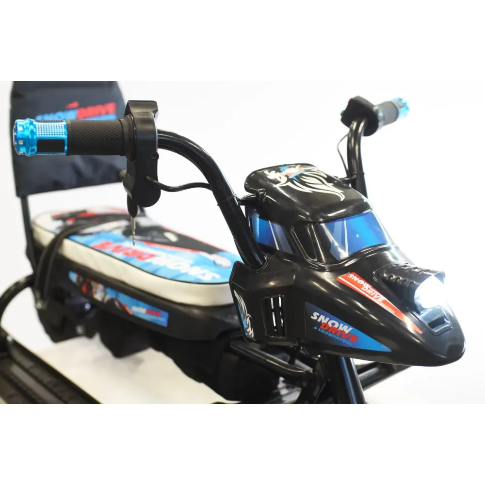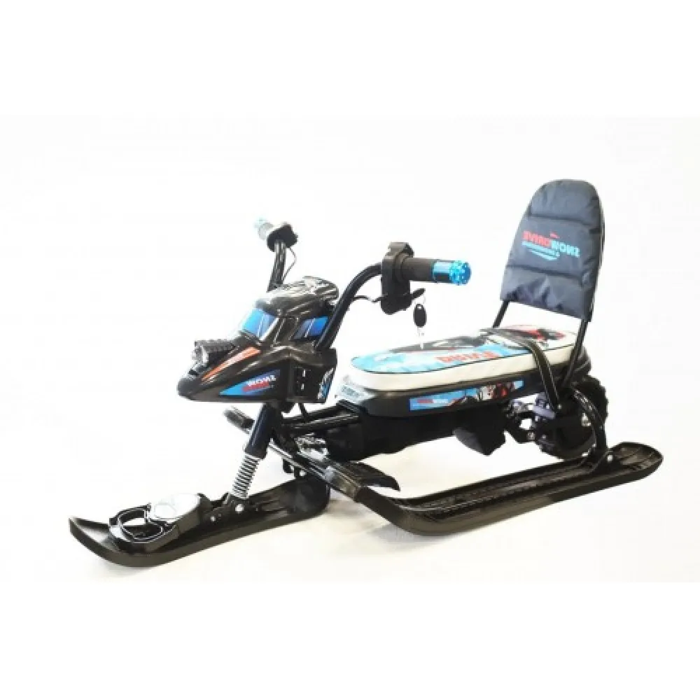 Конструкция тс изготовлена из ударопрочного надежного материала. Особое внимание родителей перед выбором электроснегоката привлекаете степень комфорта и удобства. Сиденье со спинкой – мягкое и эргономичное, рассчитано на продолжительную эксплуатацию без ощущения усталости. Мощность электродвижка в 350 Вт гарантирует развитие скоростных параметров до 25 км/час и преодоление без дополнительной подзарядки дистанции до 20 км.