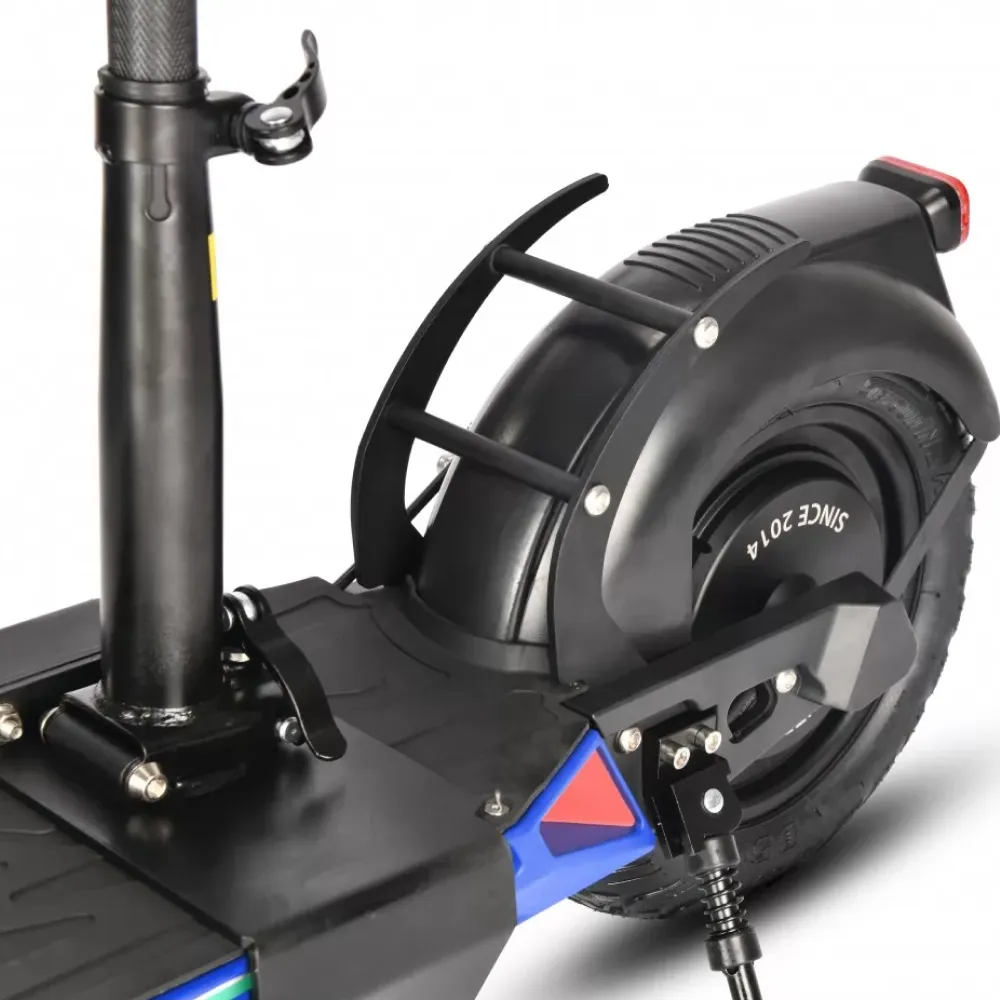 Футуристический внешний вид вызывает восторг и зависть одновременно. Большие надувные колеса (11 дюймов) изготовлены из прочной резины. Алюминиевый сплав рамы имеет небольшой вес (23 кг) и свободно выдерживает нагрузку до 125 кг. Компактные размеры 115*58*49 см и складная конструкция позволяют брать с собой в загородные путешествия. Дисковая тормозная система на каждом колесе обеспечивает быструю полную остановку. Удобное сидение идеально повторяет анатомические формы тела. Амортизация усовершенствована и хорошо скрывает дорожные ямы. Дека 22*47 см имеет нескользящую поверхность для большего удобства поездок.