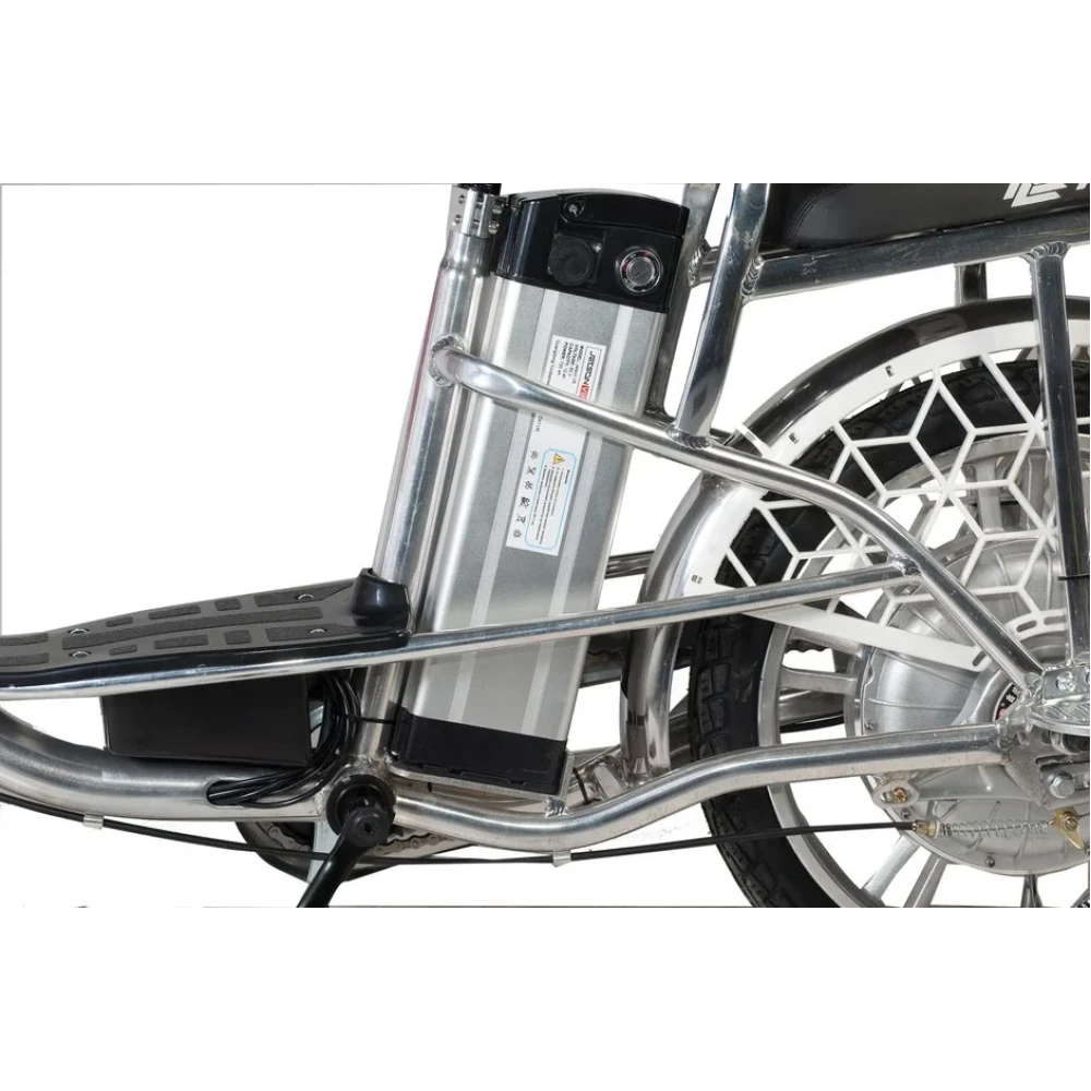 Электровелосипед оснащен большими устойчивыми колесами, мягким сиденьем для водителя и пассажира. Второе имеет удобную спинку, снижающую нагрузку с позвоночника. Техника оснащена всем необходимым для активного время провождения, поездки в магазин