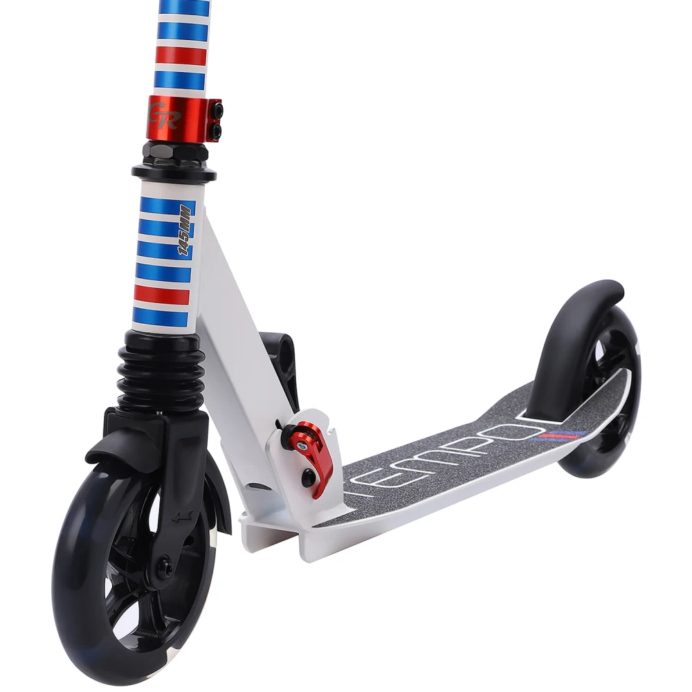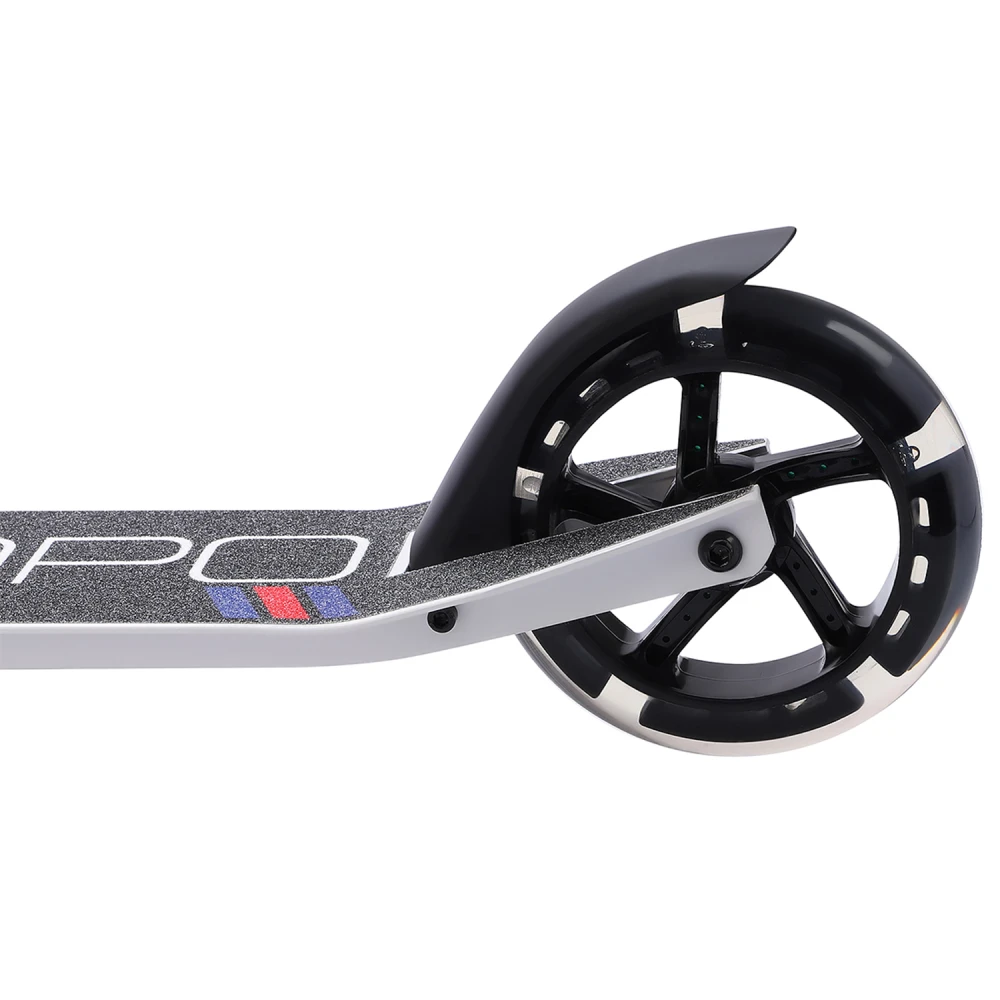 Алюминиевая дека размерами 480*100 мм по длине и ширине комфортная для размещения двух стоп одновременно. Покрыта антискользящей шкуркой, предупреждающей соскальзывание стоп. Прорезиненные грипсы повторяют анатомические части рук, удобные, не провоцируют запотеванием. 145 мм колеса с подшипниками ABEC-7 накатистые, обещают максимальный разгон. Светящиеся колеса увеличивают степень безопасности, подчеркивают эксклюзивность модели.