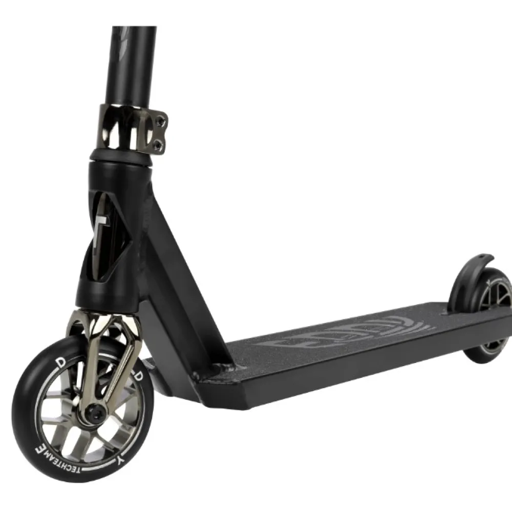 Трюковой TECHTEAM TT EDDY Techteam Eddy – Один из самых лёгких трюковых самокатов актуального модельного ряда TT. Этот самокат будет отличным выбором для начинающего райдера и прекрасно может подойти райдерам увлекающимся ездой уже продолжительное время. У Eddy есть первый в линейке techteam, тормоз из нейлона – это позволило снизить вес не уменьшив прочность конструкции, дека скутера, имеет квадратную форму и сделана из прочного алюминия, в ширину имеет диаметр 110 мм и в длину 520 мм. Задействованная площадь на деке составляет 380-400 мм.